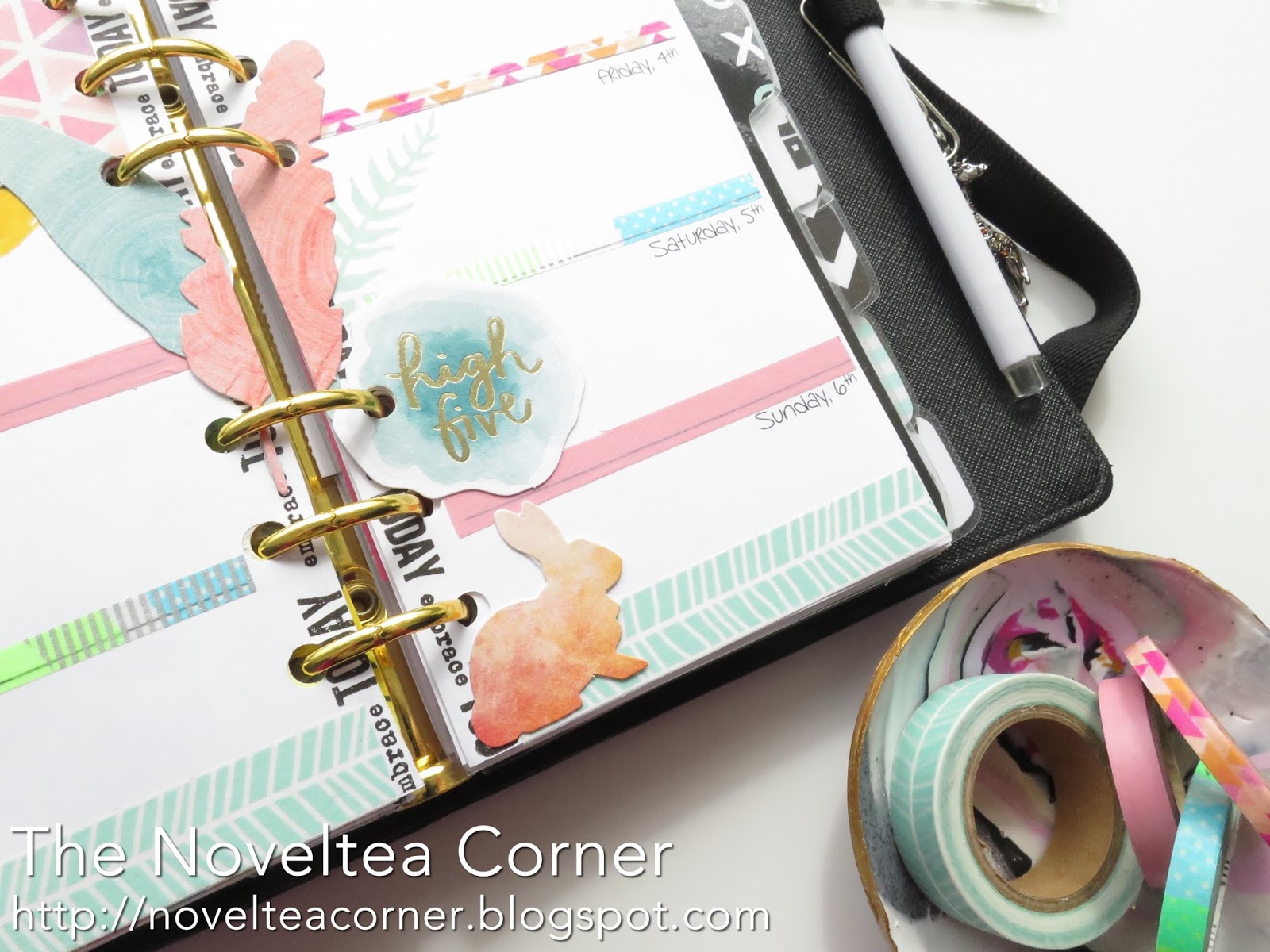 A few of my washi tapes this week are from Studio Calico (black and white floral, gold polka dot, teal ‘feather’ pattern), some from Typo (pink and orange squares) and all others I picked up from Etsy. Die cuts are from Amy Tangerine Stitched die cuts and some Amy Tangerine rub-ons. Stamps are a Heidi Swapp roller date stamp and also one set from Citrus Twist.