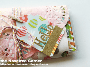 adding a scrapbooking paper sleeve, doily, twine and a tag! I sprayed my doily with Heidi Swapp Color Shine.