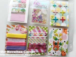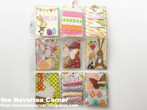 I have a huge tag punch and ages ago I punched out a whole lot of scrap paper and laminated them for washi samplers. I tried to pick Easter/spring themed colours from my stash. It’s hard to see but the paper behind the tag is the egg and chick paper from the March box.