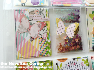 In the second row I created a removable shaker pocket out of an old Project Life page protector and added in some sequins and glitter in matching colours. The butterfly on the outside of the pocket is from the Claudia van R collection and there’s also a gold glitter foam thicker behind it, too.