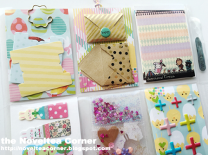 In the top row I included some die-cut tabs, some tiny envelopes (and a short letter!) and some patterned notepaper.