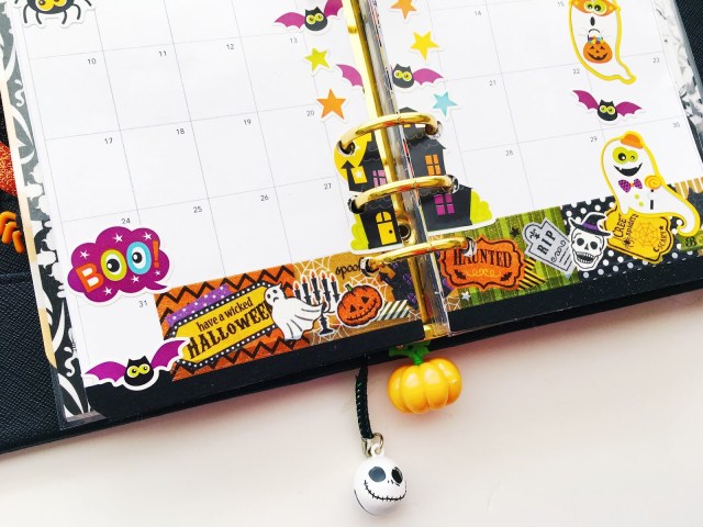 For this month I’m going to be back in my black Kikki.K time planner, and I’m using my 2016 month-on-two-page inserts. Most of these items – stickers and washi – I’ve had for ages and most of it was gifted to me, so unfortunately I can’t provide links to them! My two planner charms are both from Mrs Brimbles – the pumpkin was attached to a pen in last year’s October box and the little Jack Skellington charm is from her Etsy store. And guys, it’s a bell!