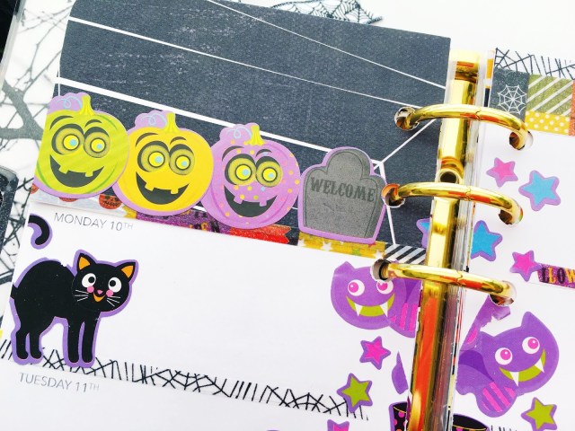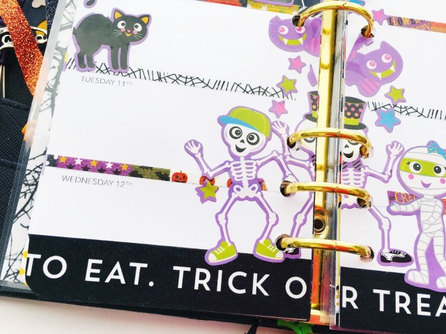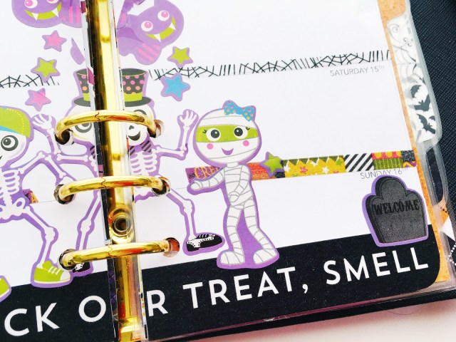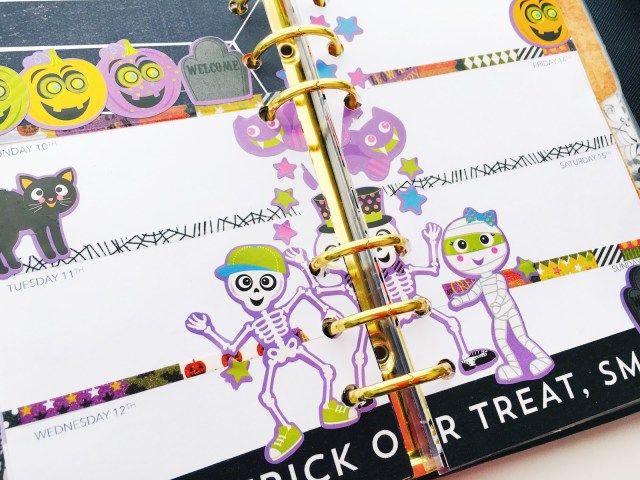 This week I raided my box of Halloween goodies and found some stickers that I think may have originally belonged to an old Darice sticker book collection (but I’ve since lost the book and just have the sticker sheets – oops!). I combined those with some old scrapbooking paper scraps and washi tape. I think the Trick or Treat washi was from Studio Calico last year.