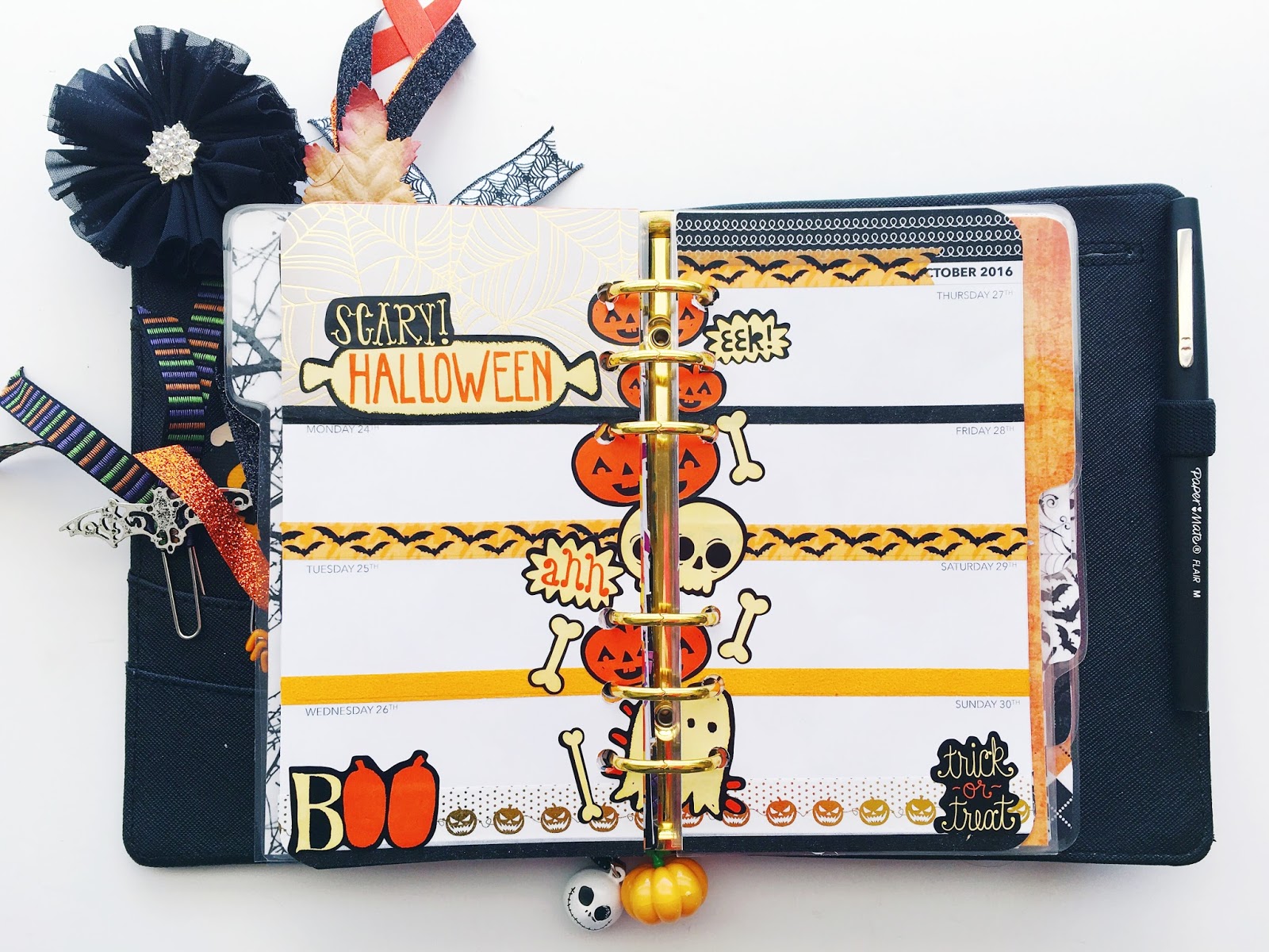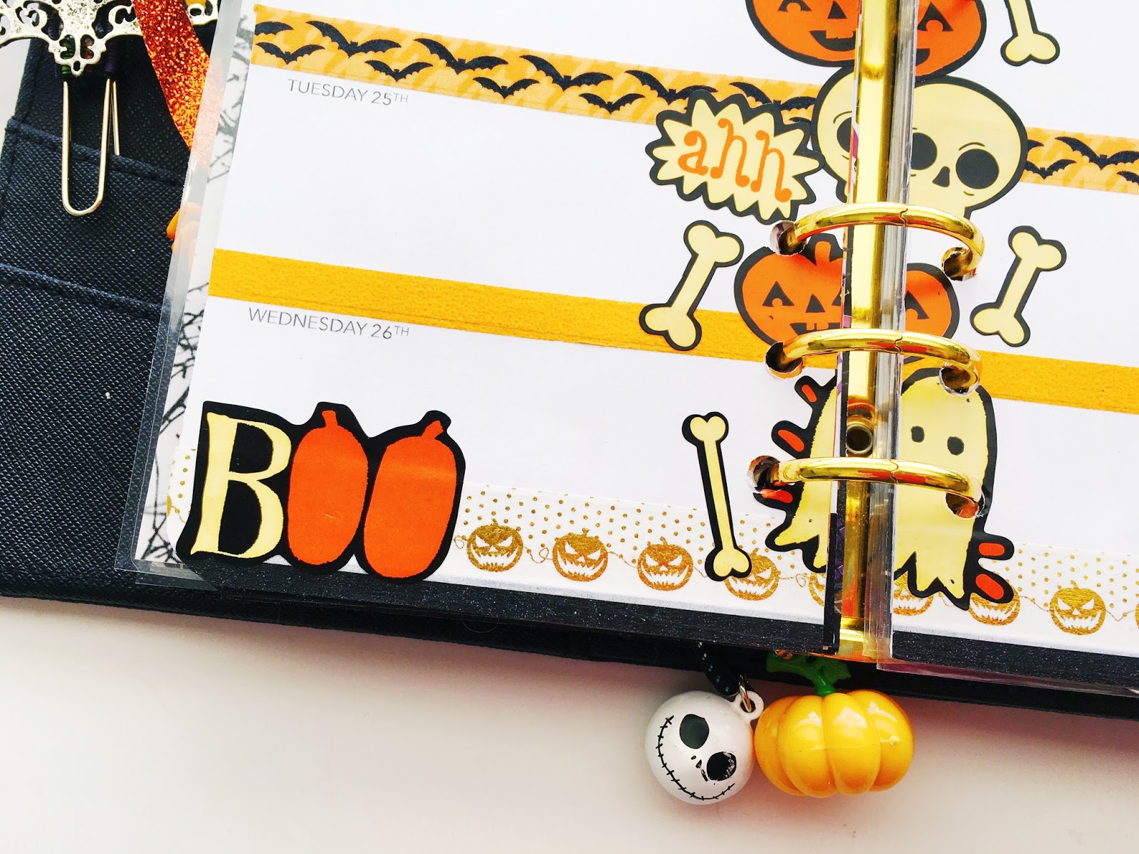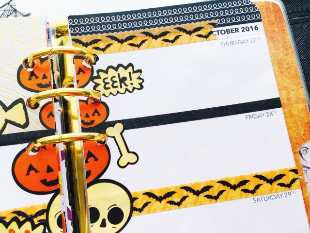 This week I dug back through my Halloween craft box and pulled out some more stickers (am I the only one who really loves the black borders around the stickers? It makes them really pop!) and paired them with some orange and black washi tapes. I wanted to add a splash of shiny gold, because I love this scary pumpkin washi that I got from Sea Salt and Paper last year.