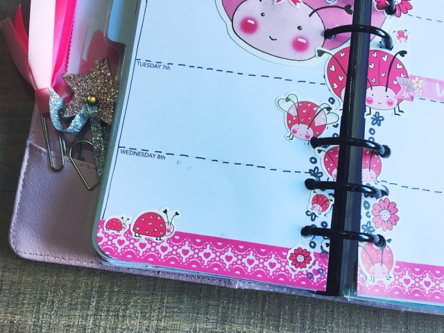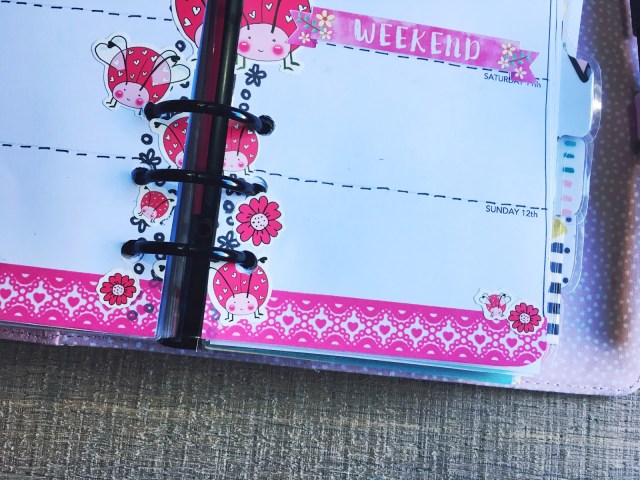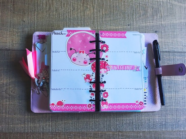 This week I’m using items from the February Brimbles Box (Love Bugs Stickers, Love Bugs Sticky Notes) and my own planner pages for March. The weekend banners are from PopMixDesigns.