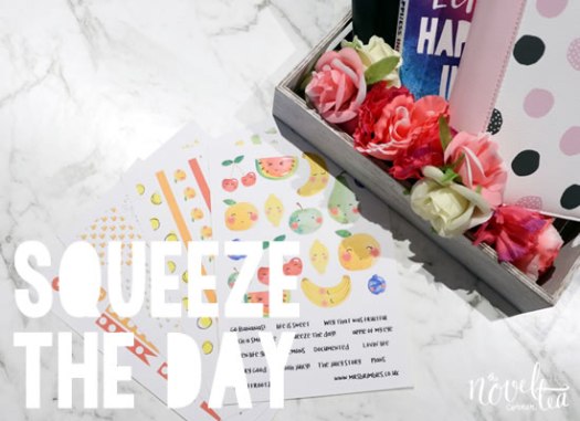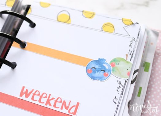 I used the ‘washi’ sticker strips to divide up my boxes, and turned one into a page banner and added the beautiful fruit characters all over my page.